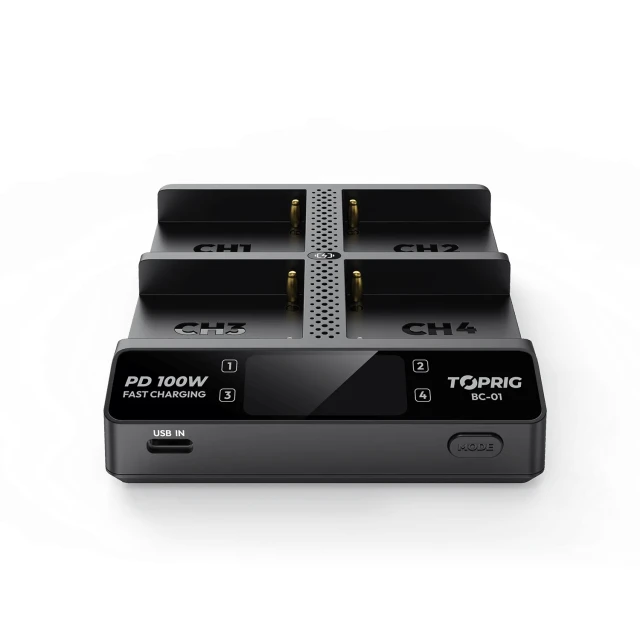 El Accsoon TopRig 100W 4-Bay NP-F Fast Charger es una solución de carga compacta y de alto rendimiento con tecnología de carga inteligente, pantalla LCD a todo color y entrada USB-C PD, diseñada para cargar de forma rápida y segura las baterías de la serie NP-F de Sony.