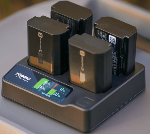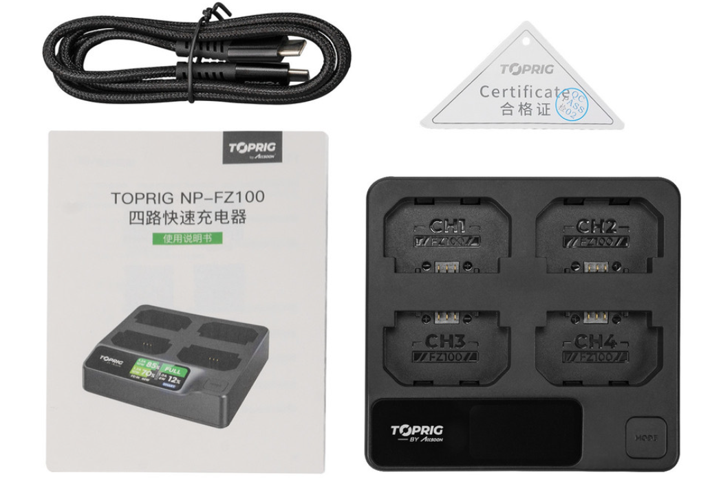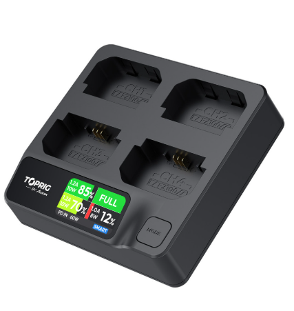 El Accsoon TOPRIG ACC-BC-02 es un cargador inteligente de 100 W y 4 ranuras para baterías Sony NP-FZ100, capaz de cargar una batería hasta un 95 % en tan solo 1,5 horas. Está equipada con una entrada USB-C PD 3.0, modos de carga inteligentes y una pantalla a color integrada, y está diseñada para una gestión rápida, segura y profesional de las baterías.