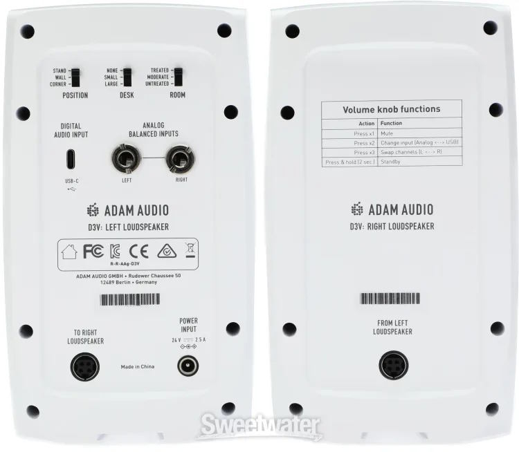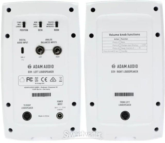 El D3V cuenta con una entrada USB-C y dos conectores TRS balanceados, por lo que ofrece conexiones digitales y analógicas de alta calidad. El control simplificado incluye un botón multifunción de volumen, interruptores intuitivos para la compensación de sala y un indicador de estado multicolor. El modelo D3V se suministra con soportes extraíbles para monitores y también con puntos de rosca integrados para el montaje de soportes de micrófono (3/8″) para una colocación perfecta en cualquier entorno.