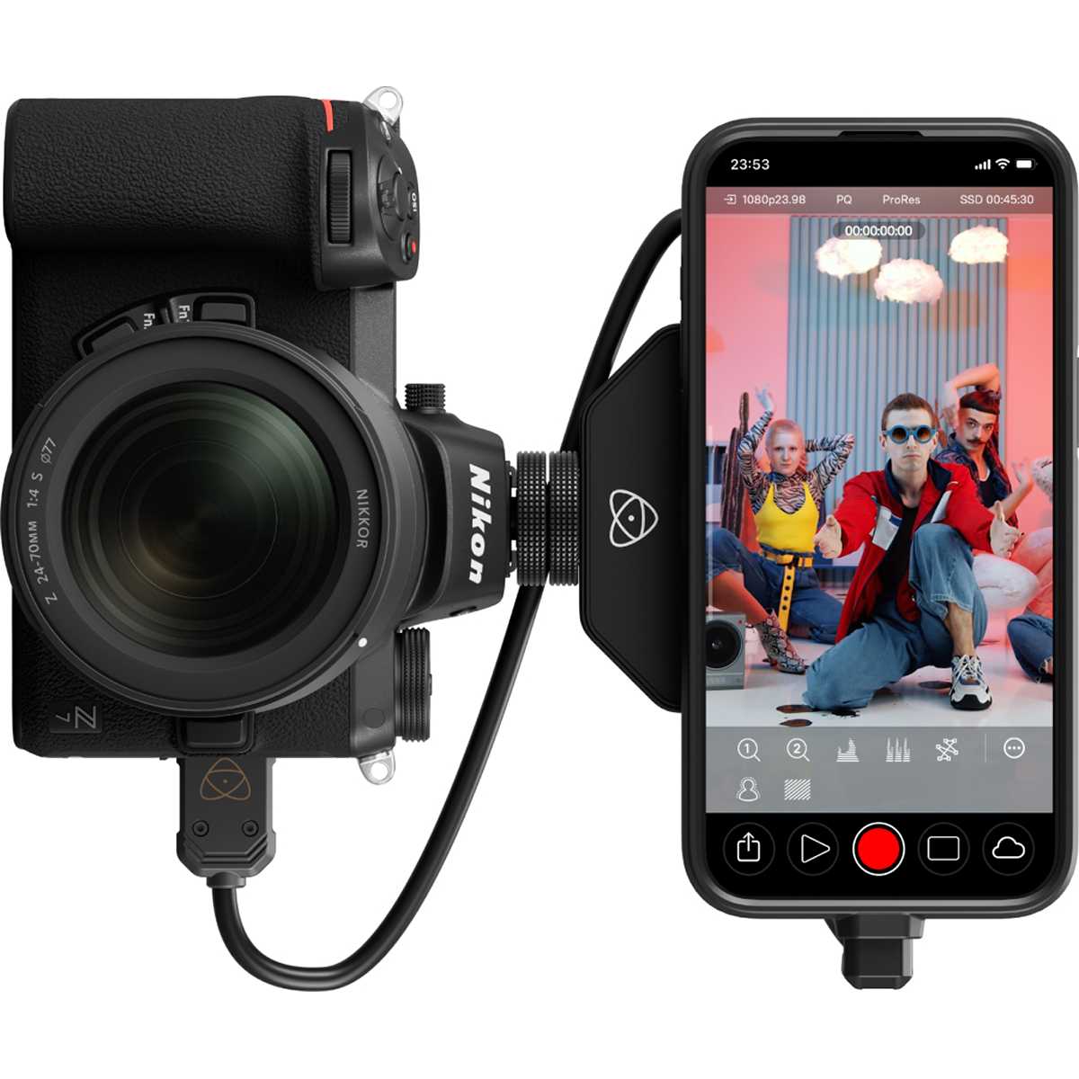 ¡Ahora tu iPhone también puede ser un Ninja! Ninja Phone es un accesorio para el iPhone 15/16 Pro y Max que permite grabar y visualizar vídeo de 10 bits procedente de cámaras profesionales con salida HDMI. ¡Aprovecha la excelente pantalla OLED de los teléfonos Apple como visor sin latencia, incluyendo funciones de monitorización profesionales! Graba en formatos Apple ProRes o H.265 y permite aprovechar la conectividad del teléfono para retransmisiones en directo y trabajar con la cámara en la nube. La aplicación especializada controla el Ninja Phone y el iPhone, y es compatible tanto con la orientación vertical como horizontal del teléfono.