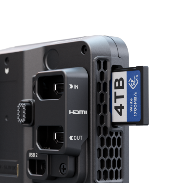 El dispositivo está equipado con una pantalla táctil HDR de 5" con un brillo de 1500 nits para una visibilidad excelente tanto en interiores como en exteriores. Permite la grabación directa por HDMI en los formatos Apple ProRes y ProRes RAW directamente desde la cámara.