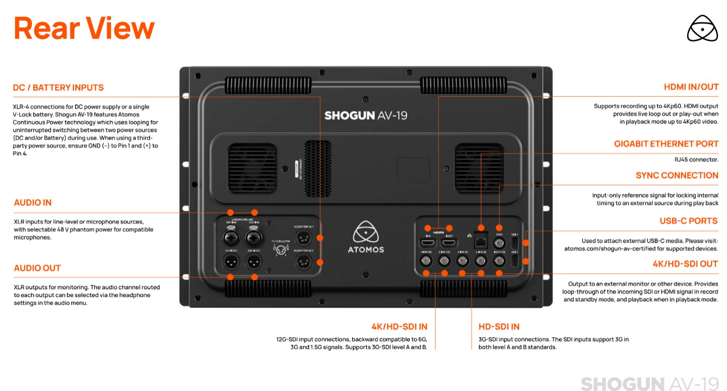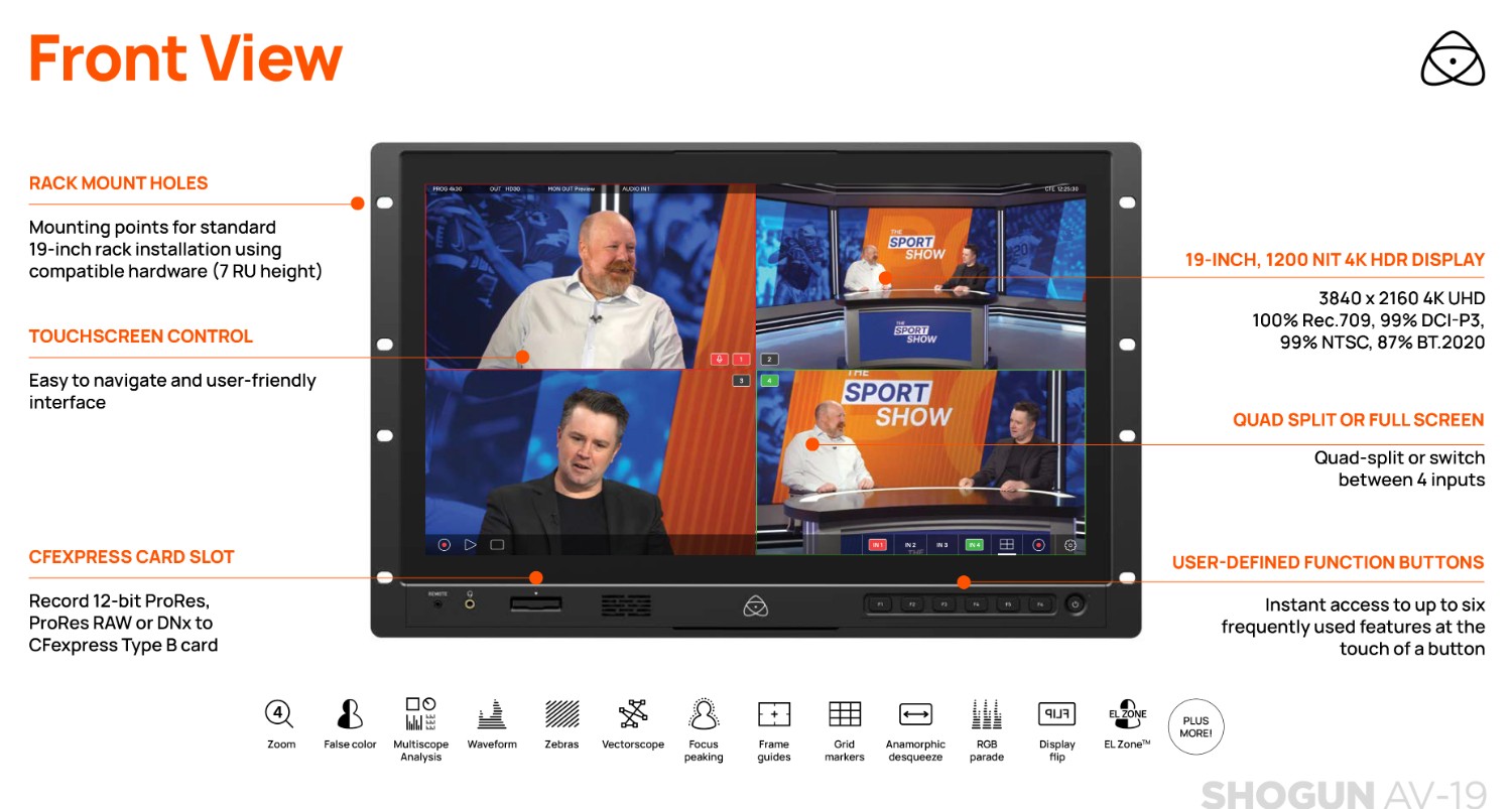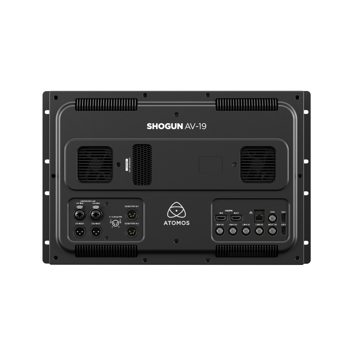 El ATOMOS Shogun AV-19 esun potentemonitor-grabador-conmutador de 19" en formato rack, compatible con 4K HDR y DCI-P3, diseñado para la producción profesional en directo, la radiodifusión y los entornos de video village.