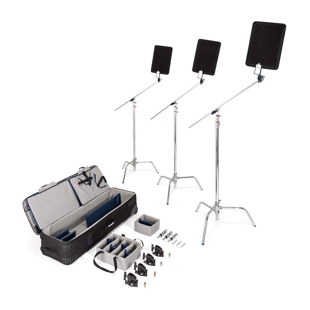 Esta maleta con ruedas tiene unas dimensiones exteriores de 128 cm x 28 cm x 40 cm (50,4 pulgadas x 11 pulgadas x 15,7 pulgadas), cuenta con suficiente capacidad de almacenamiento y soporta una carga máxima de 35 kg. El espacioso compartimento principal, diseñado para transportar hasta tres juegos de postes en C con base tipo tortuga (desmontable) y accesorios, está equipado con separadores de espuma de alta densidad y uniones en cruz que crean tres compartimentos para los postes en Cy un cuarto compartimento con correas reforzadas ajustables para guardar de forma segura los brazos extensibles. El paquete incluye dos compartimentos acolchados extraíbles, ideales para cabezales de sujeción, abrazaderas y otros accesorios pequeños, para que el equipo esté a salvo.