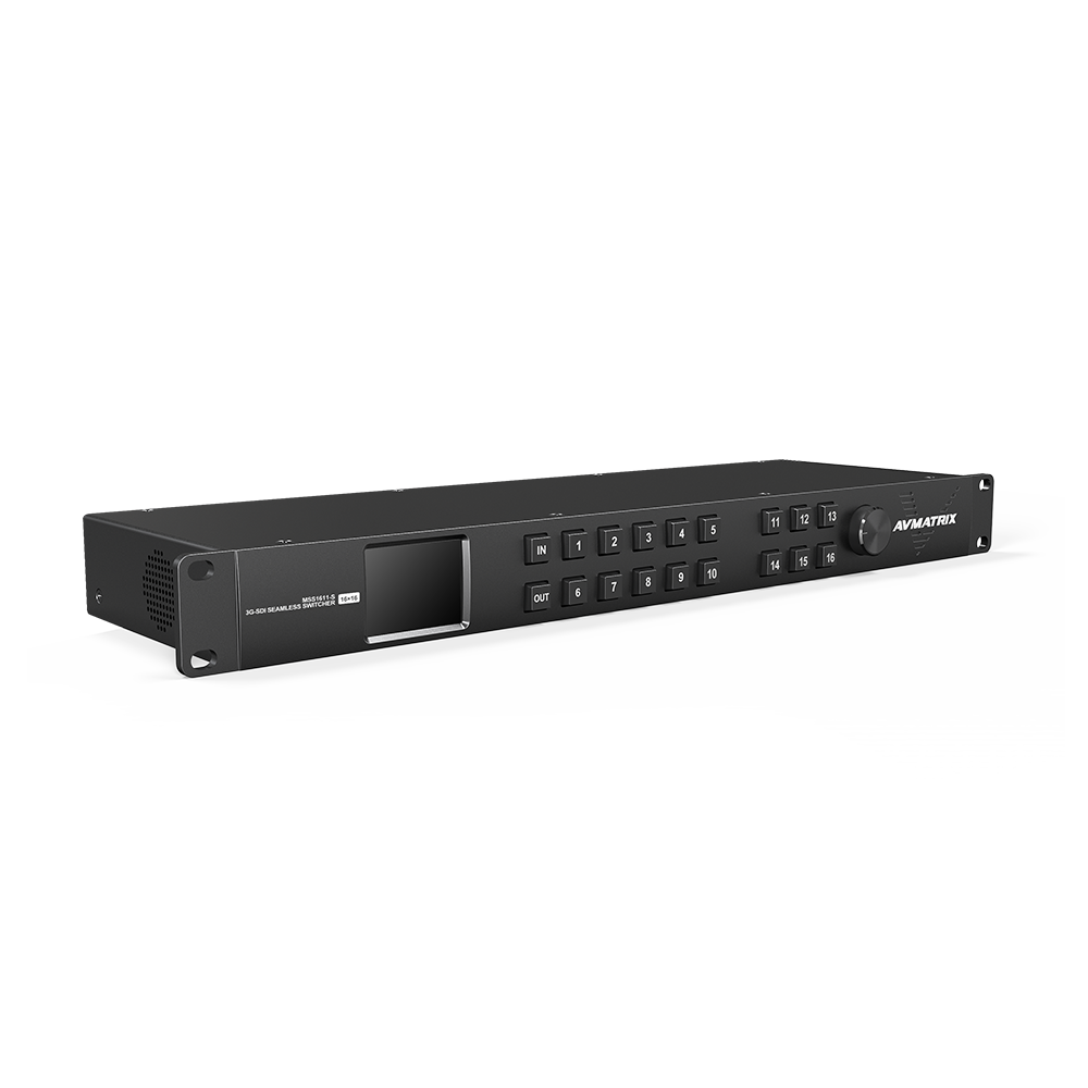El MSS1611-S es la solución perfecta para grandes proyectos de retransmisión. Este compacto conmutador de enrutamiento SDI cuenta con 16 entradas y 16 salidas, conexiones de alimentación redundantes y un elegante panel frontal de metal mecanizado con una pantalla LCD de 2,2 pulgadas para visualizar las etiquetas de enrutamiento. El enrutamiento se puede realizar mediante la selección directa de botones y un control giratorio. Este conmutador matricial 3G-SDI sin problemas es compatible con velocidades estándar 3G/HD/SD SDI, y ofrece un bypass automático para velocidades no estándar entre 270 Mbit/s y 3 Gbit/s. El sincronizador de fotogramas integrado admite la entrada simultánea de señales con diferentes frecuencias de fotogramas, lo que permite realizar una conmutación fluida sin pantalla en negro. Se puede controlar cómodamente mediante un botón en el panel frontal o mediante software de PC a través de LAN/RS-422.