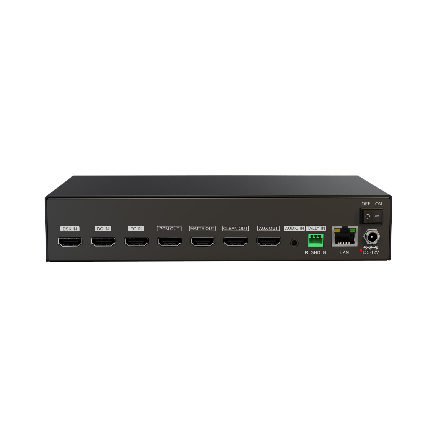 Caja externa de croma HDMI en tiempo real con 3 entradas HDMI 4K y 4 salidas HDMI 4K. Croma inteligente con un solo toque: rápido y preciso, ideal para fondos complejos. Compatible con fondos verdes/azules: adecuado para diversos escenarios con resultados profesionales. Entrada de audio externa y tally: ideal para la coordinación de varias cámaras.