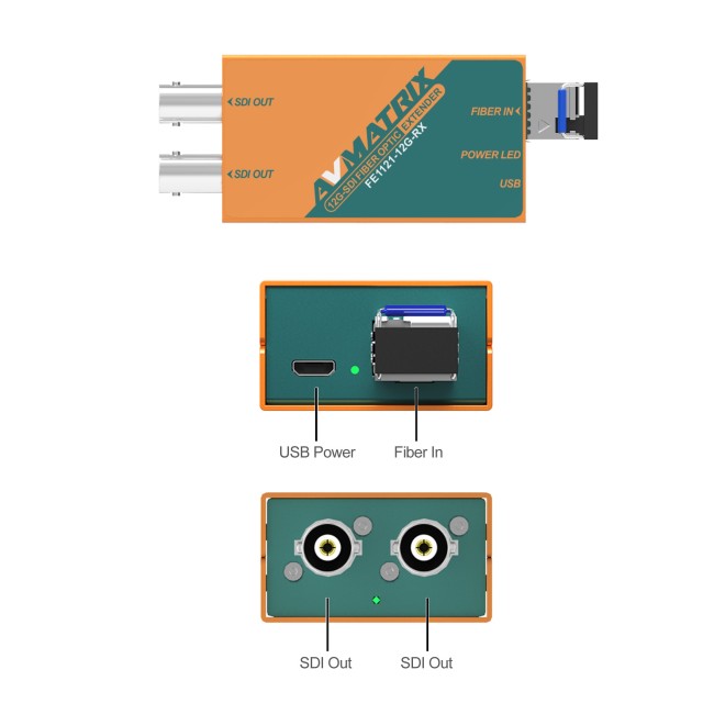 Convertidor de señal óptica SDI. Precio por par, incluido el adaptador 12G SFP/LC. La distancia de transmisión es de hasta 10 km; es compatible con SDI en los formatos SD, HD, 3G, 6G y 12G. El convertidor se alimenta a través de USB y cuenta con 2 salidas 12G SDI en el receptor.