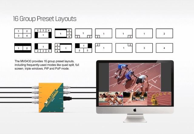 El MV0430 es un excelente y profesional multiviewer SDI, equipado con entradas 3G/HD/SD-SDI de 4 canales con adaptación automática y salidas 3G-SDI de 2 canales y HDMI de 1 canal. Hay un total de 16 diseños preconfigurados entre los que elegir. Los usuarios también pueden ajustar libremente el tamaño y la posición de la superposición UMD de 11 caracteres y del medidor de audio. Todas las funciones se pueden configurar fácilmente mediante el conmutador DIP integrado o un ordenador a través de la red LAN. El MV0430 es la opción ideal para aplicaciones de retransmisión y posproducción audiovisual.