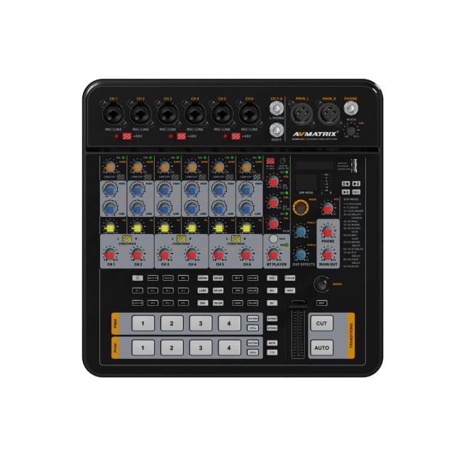• Diversos efectos de transición con controles T-bar, auto y cut