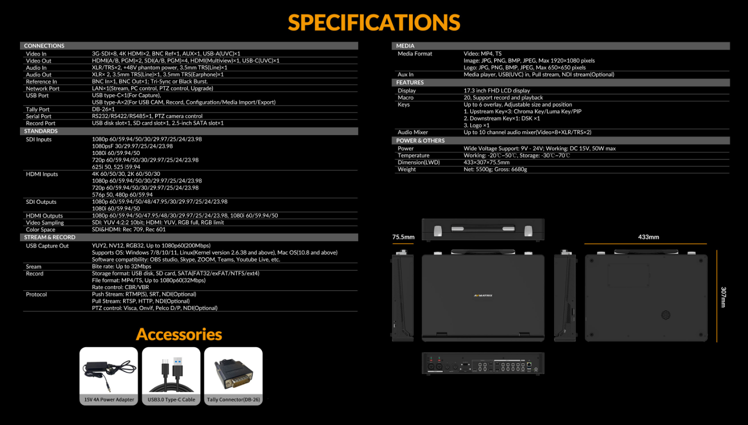 El AvMatrix Shark S8X Plus-NDI es un conmutador de vídeo de 8 canales de alto rendimiento diseñado para la retransmisión en directo y la producción de vídeo profesionales. Está equipado con una pantalla IPS FHD de 17,3 pulgadas, admite seis entradas 3G-SDI y dos entradas SDI/4K HDMI, además de ofrecer un enrutamiento flexible de múltiples fuentes. Gracias a su sólida compatibilidad con RTMP(S), SRT, RTSP y NDI, este conmutador ofrece una retransmisión en directo sin problemas. Incluye funciones de vídeo avanzadas, como croma, luma, tres superposiciones PIP, POP, DSK y superposición de logotipos, junto con transiciones fluidas mediante las funciones T-bar, auto o cut. Se admite la grabación y reproducción a través de USB, tarjeta SD o almacenamiento SATA. El dispositivo también ofrece una entrada de audio profesional XLR con alimentación fantasma de 48 V, audio de vídeo integrado y opciones de salida versátiles. Otras características incluyen un sistema de control PTZ de 8 canales, compatibilidad con macroscript y un puerto GPIO para sumadores, lo que lo convierte en una opción de primera para eventos en directo, estudios y aplicaciones de retransmisión.