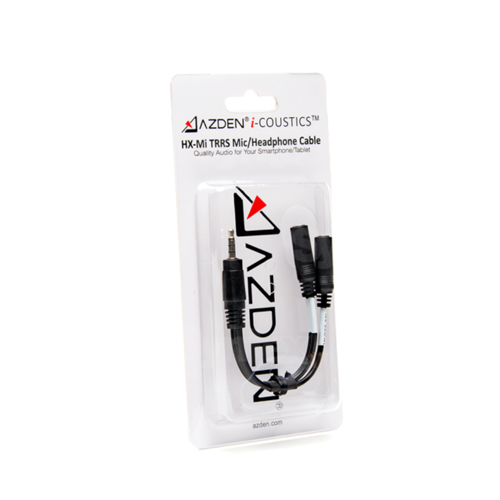 El cable de micrófono/auriculares Azden® i-Coustics™ HX-Mi TRRS está diseñado para que tu micrófono Azden sea compatible con tus dispositivos móviles. Solo tienes que conectar tu micrófono Azden a la entrada de micrófono del HX-Mi y conectar el cable a la toma de micrófono/auriculares de tu dispositivo. Conecta tus auriculares a la entrada de auriculares del HX-Mi para escuchar tus grabaciones. El HX-Mi funciona con cualquier dispositivo que tenga un conector TRRS, incluidos el iPhone® 3/4/5/6, el iPad® (3.ª generación y posteriores), el Samsung Galaxy S® 3/4/5, el Galaxy Tab® 3 y la mayoría de los dispositivos Android™.