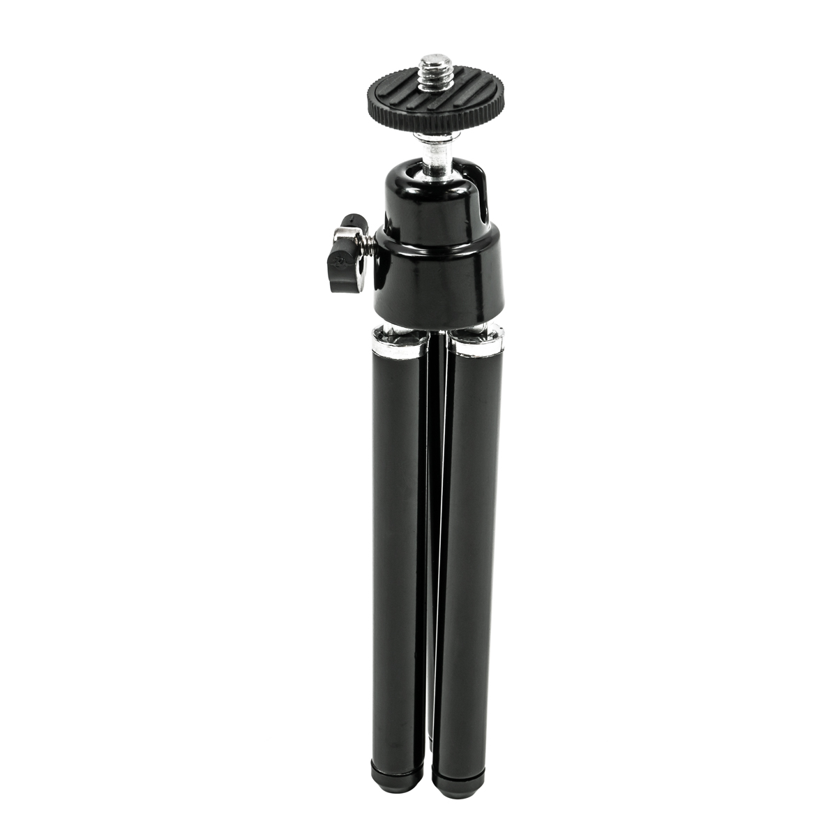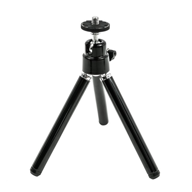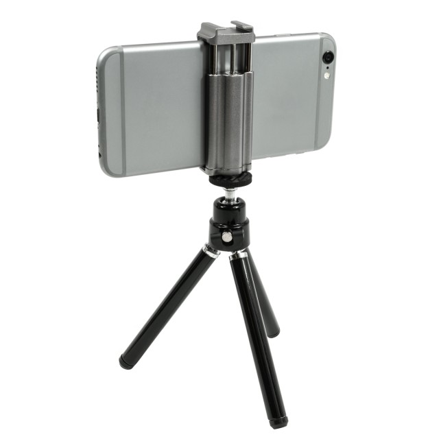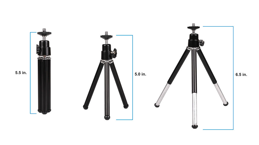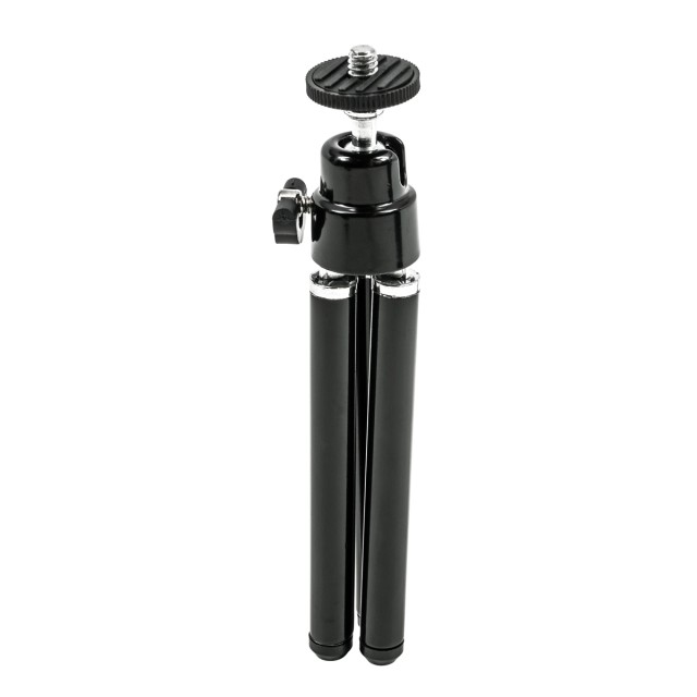 Este trípode miniatura ligero funciona bien como soporte de mesa para tu smartphone o, al plegar las patas, se convierte en un mango para grabar vídeos sobre la marcha. Las patas extensibles permiten ajustar la altura del trípode en un rango de 5,0 a 6,5 pulgadas. El cabezal articulado con rótula permite ajustar la inclinación y el ángulo ideales. La inclinación de 90º para la orientación vertical es posible gracias al lado estriado, mientras que el cabezal se puede fijar en su sitio mediante un tornillo de cabeza de mariposa. Gracias a la rosca de montaje universal de ¼"-20, el trípode también es compatible con otras cámaras pequeñas.