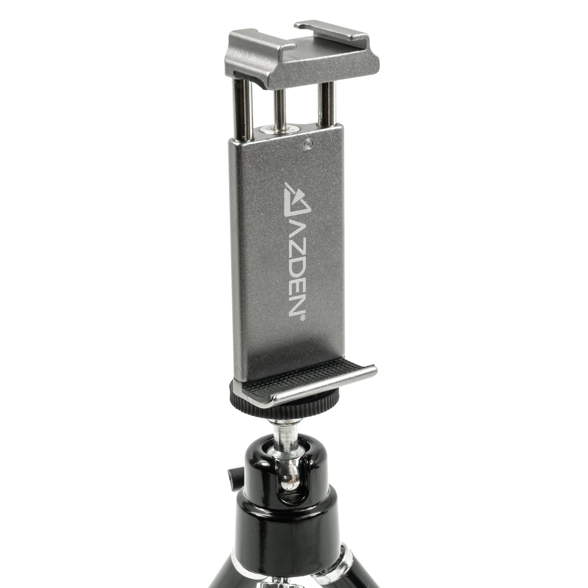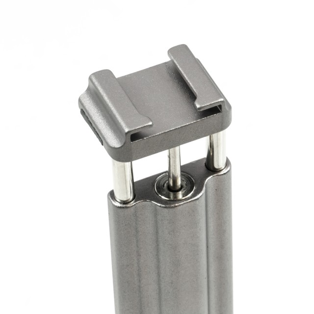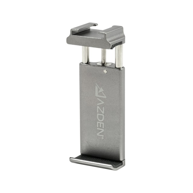 El soporte incluido utiliza una abrazadera con resorte que se adhiere firmemente a casi cualquier smartphone. Se adapta a teléfonos con un ancho de entre 2,4 y 3,3 pulgadas, por lo que es compatible incluso con los smartphones más grandes (phablets) del mercado actual. A diferencia de muchos otros soportes para teléfonos, el nuestro está equipado con una ranura cold-shoe que permite acoplar un micrófono, un receptor inalámbrico u otros accesorios. El soporte en sí se puede fijar al trípode incluido en el paquete o a cualquier otro soporte o barra de cámara mediante un orificio roscado de ¼"-20. El soporte está fabricado para durar, tiene una estructura totalmente metálica y ha sido sometido a pruebas de calidad que garantizan una resistencia de más de 6000 accionamientos.