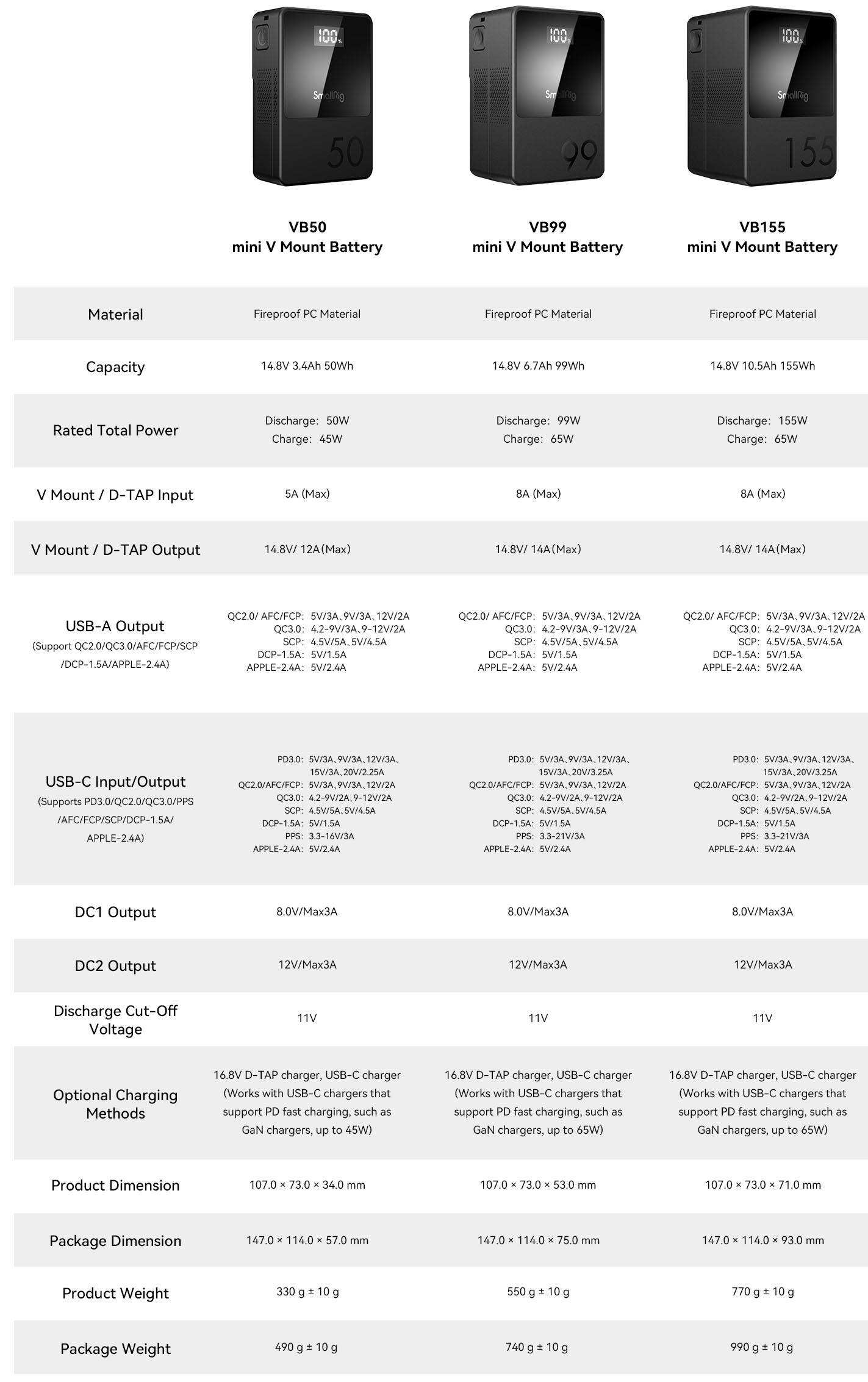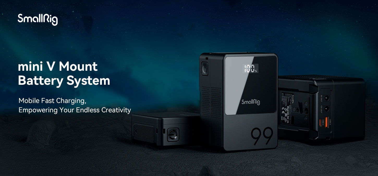 La popular marca de accesorios para cámaras SmallRig ha entrado en el mundo de las baterías profesionales V-Mount: pronto estarán disponibles en versiones con capacidades de 3,4 Ah (VB50), 6,7 Ah (VB99) y 10,5 Ah (VB155). Podrás disfrutar de un diseño compacto (147 x 114 x 57, 147 x 75 y 147 x 93 mm, peso de 330, 740 y 990 g), control inteligente de la carga y protección contra sobretensión, cortocircuitos, etc., salidas integradas USB-A/USB-C/8V=/12V=, pantalla OLED que muestra el estado de la batería, carga mediante interfaz USB-C, etc.