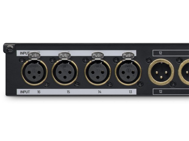 El patchbay cuenta con 16 conectores XLR en el panel frontal. Los primeros doce, etiquetados como INPUT 1, 2,… 12, están equipados con conectores XLR hembra y sirven para llevar la señal a las entradas de los dispositivos conectados. Los cuatro conectores restantes, etiquetados como OUTPUT 13, 14, … 16, son del tipo XLR macho y están destinados a las salidas de los dispositivos conectados. El panel frontal de aluminio cuenta con asas laterales para su instalación en un rack de 19″.