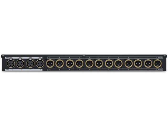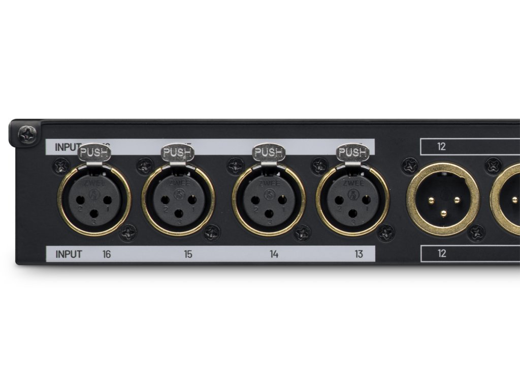 El patchbay cuenta con 16 conectores XLR en el panel frontal. Los primeros doce, marcados como INPUT 1, 2,… 12, están equipados con conectores XLR hembra y sirven para llevar la señal a las entradas de los dispositivos conectados. Los cuatro conectores restantes, etiquetados como OUTPUT 13, 14, … 16, son del tipo XLR macho y están destinados a las salidas de los dispositivos conectados. El panel frontal de aluminio cuenta con asas laterales para su instalación en un rack de 19″.
