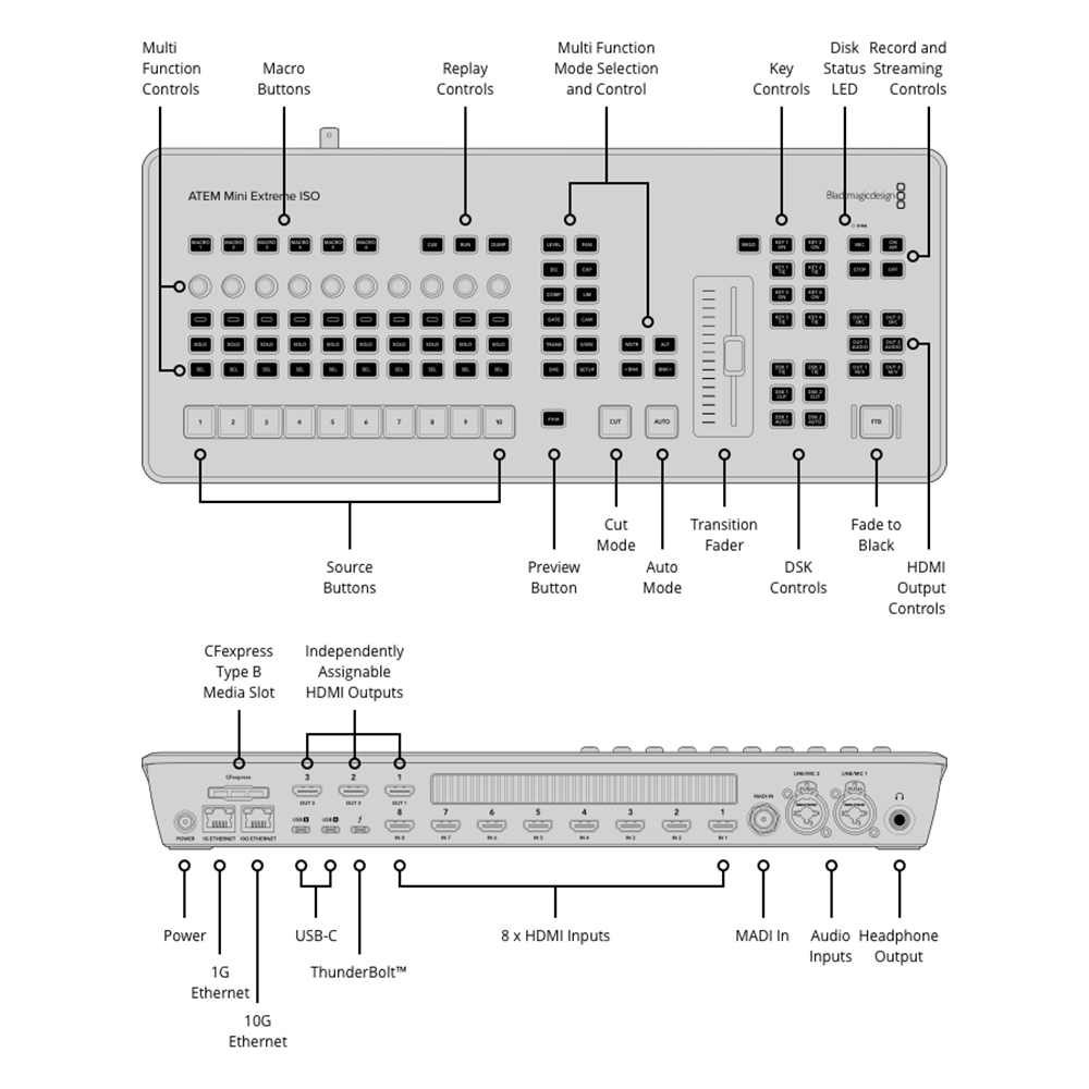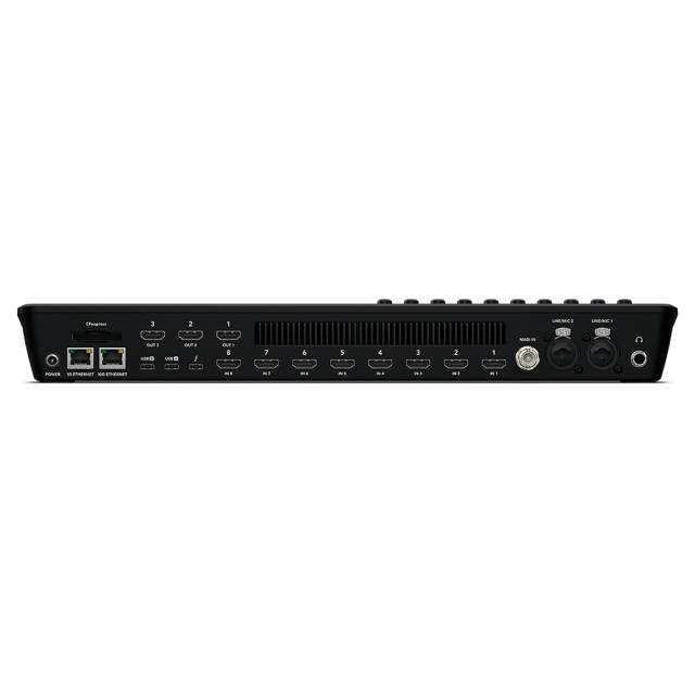 El ATEM Mini Extreme ISO G2 es una combinación de conmutador y panel de control.El panel frontal incluye botones para seleccionar fuentes, activar transiciones y ajustar efectos de vídeo. Tampoco falta una palanca manual para las transiciones yel fader( ). En el panel frontal se encuentra el área de control para la mezcla de audio con medición en directo. También hay botones paragrabar, transmitir y botones independientes para la salida, que permiten cambiar entre 8 cámaras, el programa, la vista previa, la vista múltiple o el estado de Fairlight.