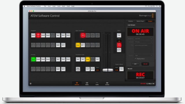 El modelo ATEM Mini Pro incorpora además un codificador de hardware para la transmisión en directo de programas a través de una interfaz Ethernet. Esto permite transmitir, por ejemplo, a plataformas como YouTube, Facebook y Twitch, con alta calidad, sin riesgo de pérdida de fotogramas y con una configuración más sencilla. La aplicación ATEM Software Control ofrece una serie de funciones para configurar la transmisión; además, la vista previa del estado de la emisión se muestra en la salida multivista, incluyendo el flujo de datos.