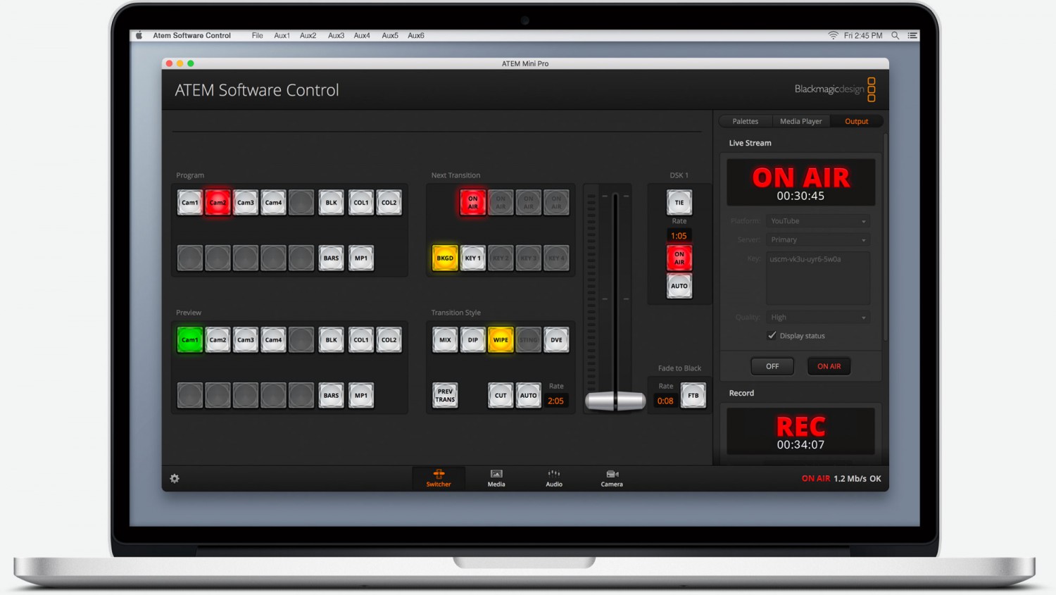 Los modelos ATEM Mini Pro incorporan además un codificador de hardware para la transmisión en directo de programas a través de una interfaz Ethernet. Esto permite emitir, por ejemplo, en plataformas como YouTube, Facebook y Twitch, con alta calidad, sin riesgo de pérdida de fotogramas y con una configuración más sencilla. La aplicación ATEM Software Control ofrece una serie de funciones para configurar la transmisión; además, la vista previa del estado de la emisión se muestra en la salida multivista, incluyendo el flujo de datos.
