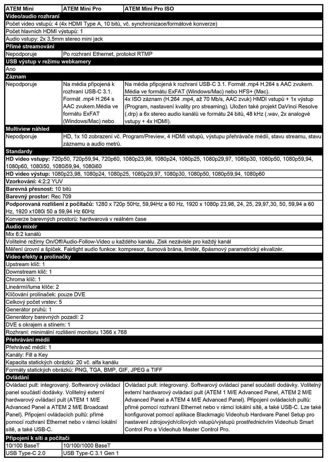 Todos los modelos de la serie ATEM Mini cuentan con una interfaz USB que funciona en modo cámara web para la salida del programa transmitido y una salida HDMI adecuada, por ejemplo, para la visualización en televisores y proyectores. Los modelos ATEM Mini Pro permiten utilizar la interfaz USB también para grabar en discos USB. Las entradas de micrófono permiten conectar micrófonos para grabar entrevistas y comentarios de presentaciones.