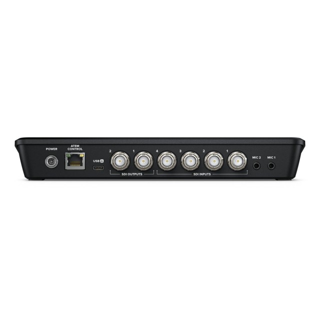 ¡Los modelos ATEM SDI son las versiones 3G-SDI de las populares consolas de mezcla ATEM Mini! Los modelos ATEM SDI y ATEM SDI Pro ISO cuentan con 4 entradas SDI, mientras que la versión ATEM SDI Extreme ISO dispone de 8 entradas SDI con conversión de estándares y sincronización de señal. La interfaz USB puede funcionar en modo cámara web; las variantes Pro y Extreme ofrecen además funciones específicas para la transmisión de vídeo. Las mesas de mezcla ATEM SDI cuentan además con un panel compacto integrado con botones para seleccionar entradas y efectos. Los modelos ATEM SDI Pro y Extreme ofrecen además botones para controlar la grabación y la transmisión, así como para cambiar la salida entre las cámaras y los modos Programa y Multiview. El panel trasero cuenta con entradas SDI para cámaras u otras fuentes de vídeo, entradas de micrófono, interfaz USB y salidas SDI («Aux»).