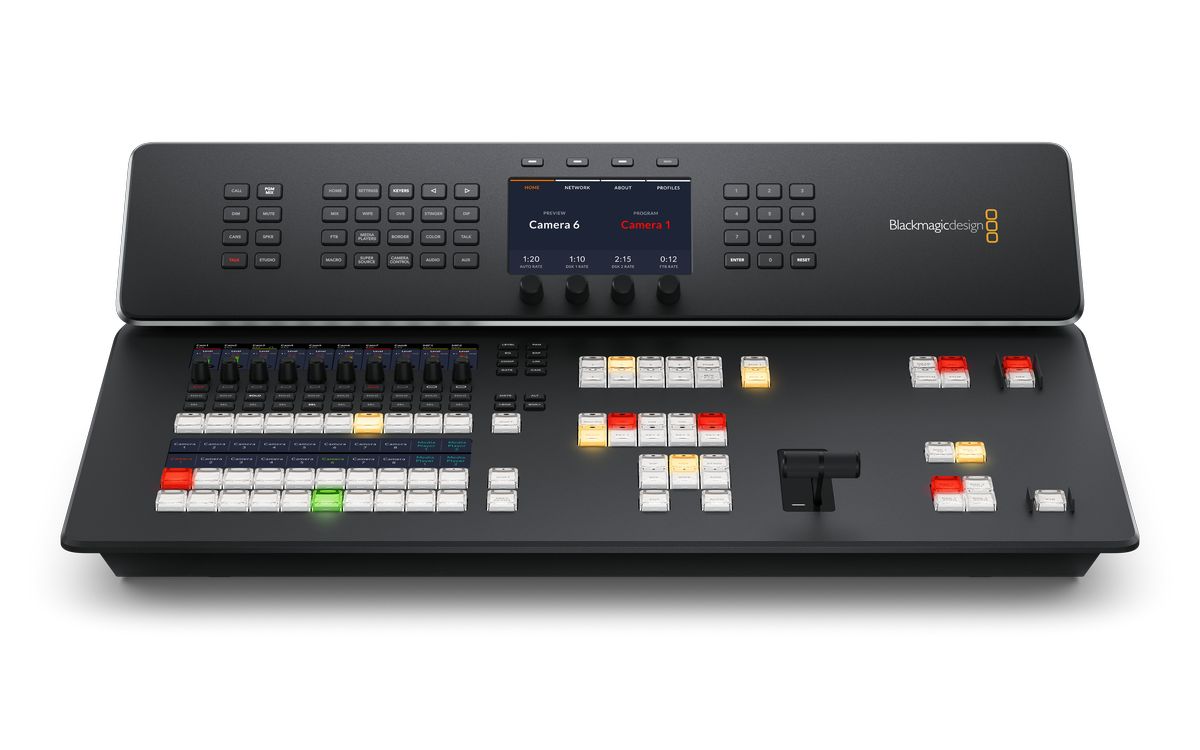 El panel de control integrado de los modelos ATEM Television Studio HD ofrece botones para seleccionar fuentes de vídeo, iniciar transiciones y ajustar efectos, así como una sección de audio dedicada con medición de niveles en la pantalla LCD. Los botones son de la misma calidad que los de las consolas de alta gama, y no falta la palanca T-Bar para la transición manual.