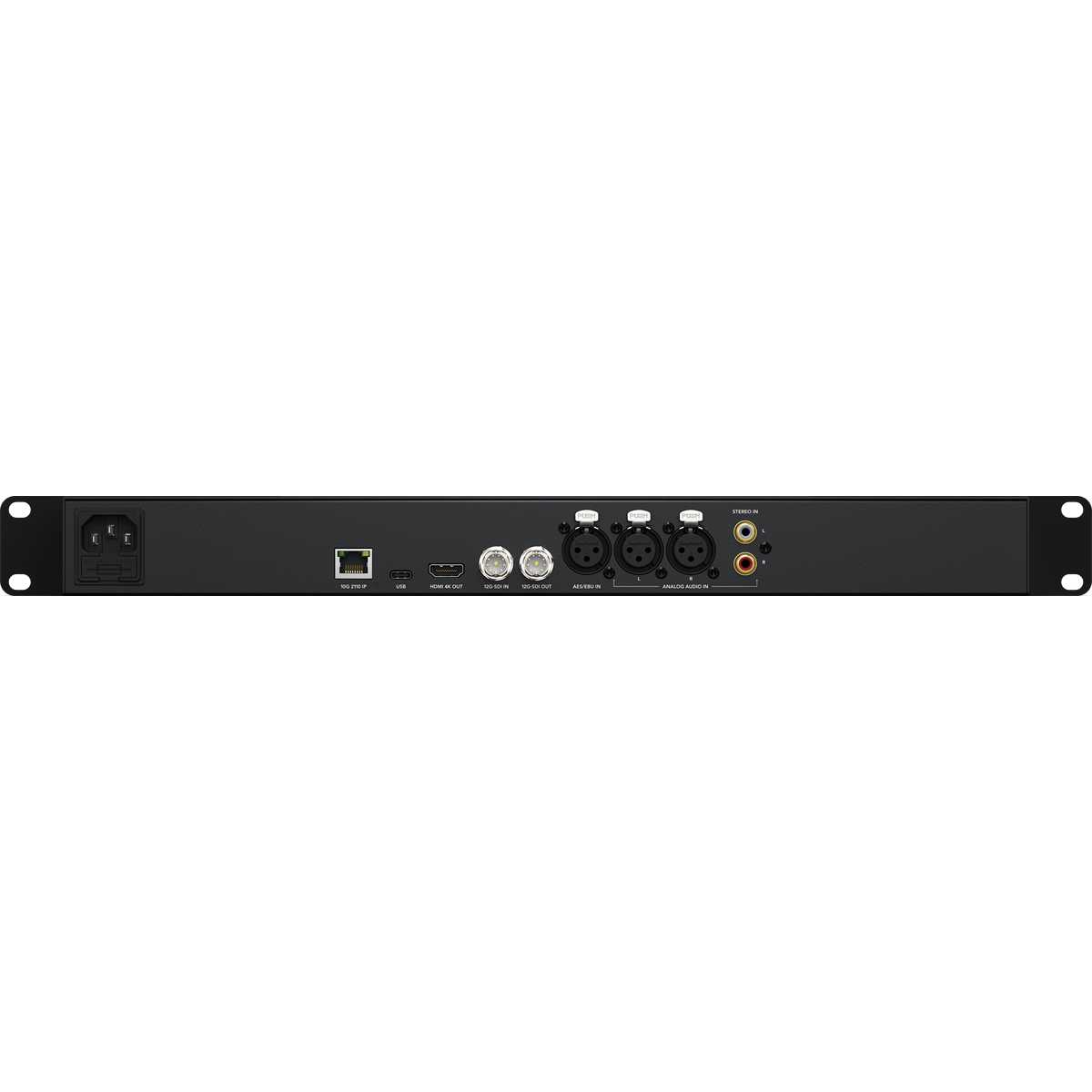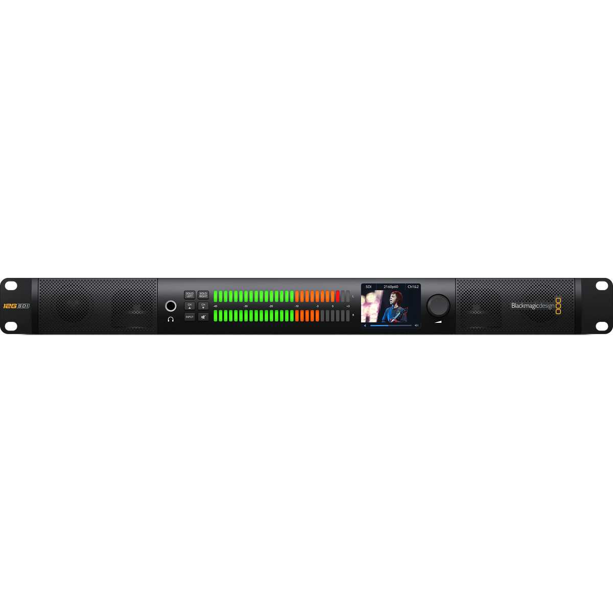 El Blackmagic Audio Monitor 12G G3 es un potente monitor de audio que ofrece una excelente calidad de sonido en un diseño de rack de 1RU de altura. Su diseño destaca por sus grandes medidores de audio con una respuesta precisa y la posibilidad de cambiar entre diferentes estándares de medición de audio. También dispone de una entrada 12G-SDI para monitorizar el audio desde equipos de vídeo profesionales, y ahora también de una entrada de vídeo IP 10G Ethernet SMPTE-2110 para conectarse a sistemas de vídeo IP sin necesidad de un convertidor externo. ¡No faltan tampoco las tradicionales entradas analógicas balanceadas XLR, las no balanceadas RCA y las digitales AES/EBU! También hay una salida de vídeo HDMI para conectarse a televisores de pantalla grande o monitores de ordenador. El chasis metálico está anodizado en negro y combina con el resto del moderno equipamiento de Blackmagic Design. Además, la construcción totalmente metálica elimina las vibraciones acústicas incluso a volumen alto. En el panel frontal hay botones para poner en solo el canal izquierdo o derecho, seleccionar entre entradas 12G-SDI, 2110 IP, AES/EBU, XLR o RCA, y silenciar los altavoces. También hay una salida de auriculares directamente en el panel frontal.
