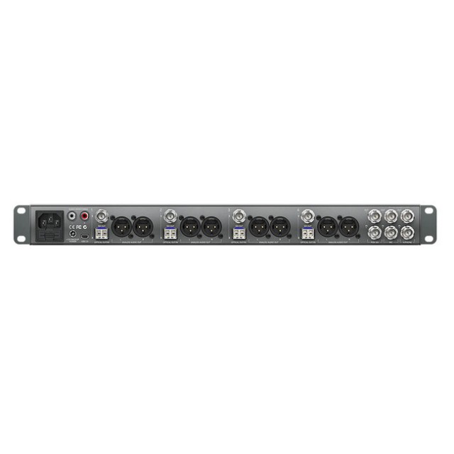 El nuevo modelo del ATEM Studio Converter también ofrece compatibilidad con el estándar 6G-SDI para el futuro soporte de la resolución Ultra HD. Por el momento, el soporte del estándar 6G-SDI no está disponible en la interfaz óptica, pero el hardware de este nuevo modelo está totalmente preparado para el futuro funcionamiento con los estándares Ultra HD. El ATEM Studio Converter 2 dispone de salidas 6G-SDI convertidas a partir de entradas ópticas, por lo que la señal de la cámara se puede conectar directamente a los conmutadores (por ejemplo, de la serie ATEM). Además, cada uno de los módulos ópticos cuenta con un par de salidas de audio con conectores XLR, de modo que la señal de audio originalmente incrustada en la señal de la cámara se puede conectar directamente a las mesas de mezclas. El ATEM Studio Converter ofrece además una entrada SDI global para transmitir la señal de salida del conmutador a los puestos de cámara a través de un cable óptico. Esta señal transmite también la comunicación de voz entre la sala de control y los operadores de cámara.