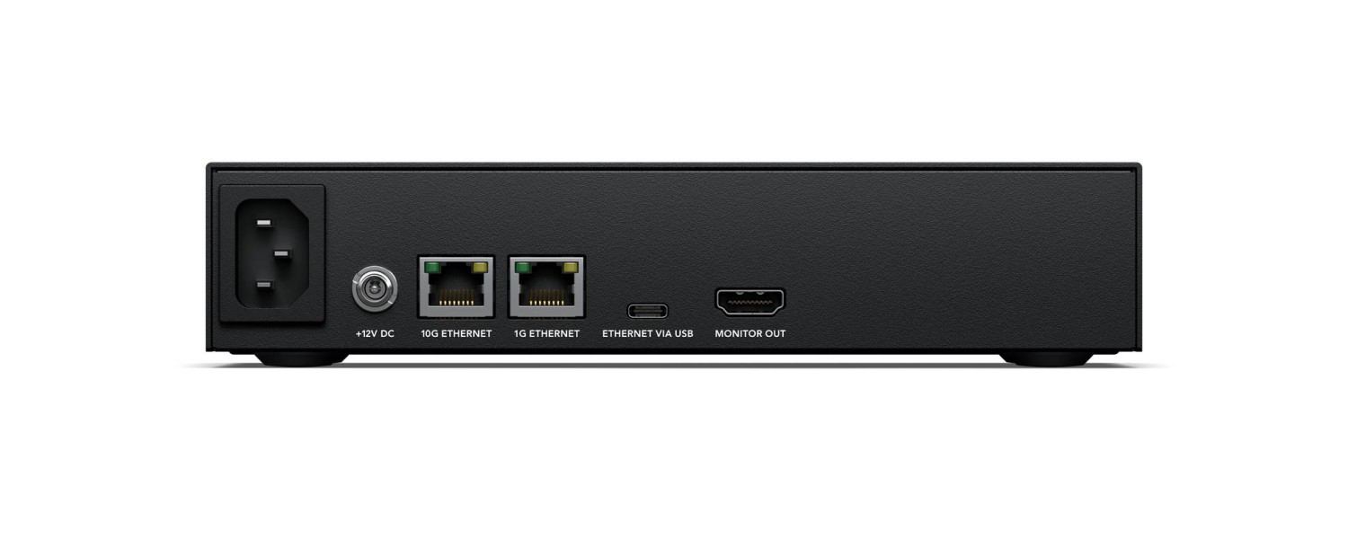 El Blackmagic Cloud Store Mini ofrece un diseño versátil y fácilmente transportable —adecuado no solo para uso de sobremesa, sino también para su montaje en armarios de equipos— y un funcionamiento silencioso. Su corazón es una matriz de cuatro tarjetas flash M.2 para una velocidad máxima, así como puertos Ethernet de 10G y 1G con un conmutador interno. La salida de monitorización HDMI permite supervisar la actividad del almacenamiento en un monitor externo, en tiempo real.