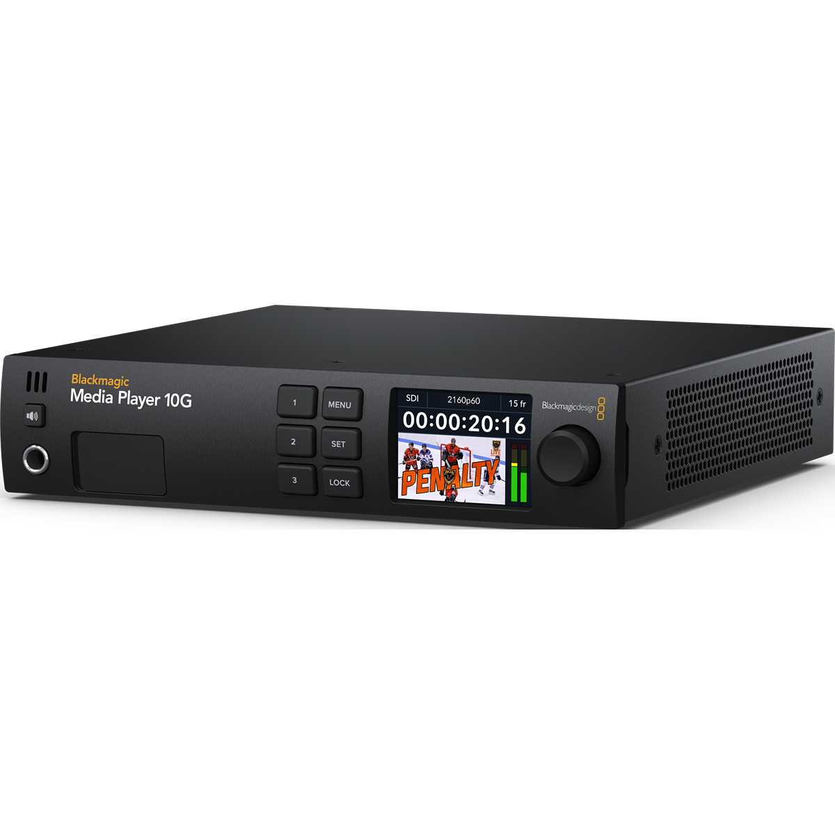Blackmagic Media Player incluye todo lo que los usuarios necesitan para la reproducción de medios en entornos de emisión. Se puede colocar fácilmente sobre la mesa de trabajo o montarlo en un soporte utilizando el adaptador universal para soporte de Blackmagic Design. La pantalla LCD frontal ofrece información sobre el estado del vídeo, medidores de audio, etc. El medidor de audio también se puede cambiar entre el modo VU y PPM. También dispone de una toma para auriculares, un altavoz y un botón para activar el altavoz.