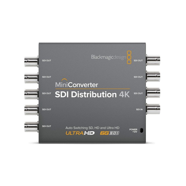 El Mini Converter SDI Distribution 4K distribuye la señal presente en la entrada SDI a 8 salidas SDI diferentes. Cambia automáticamente entre los formatos de vídeo SD, HD y Ultra HD.