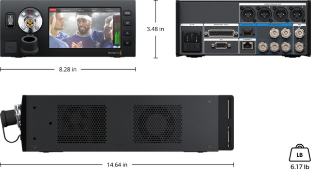 El modelo para cámara Blackmagic Camera Fiber Converter cuenta con un chasis metálico muy resistente y un diseño que combina a la perfección con la cámara URSA Broadcast. Por supuesto, incluye juntas antipolvo en los conectores y una interfaz V-Lock de primera calidad para conectar el monitor Blackmagic Studio Viewfinder. El modelo de estudio Blackmagic Studio Fiber Converter está diseñado para su montaje en un rack de ancho estándar (mediante un adaptador opcional) y cuenta en su panel frontal con un conector para la cámara y una pantalla LCD de 5” para la visualización inmediata de la señal.