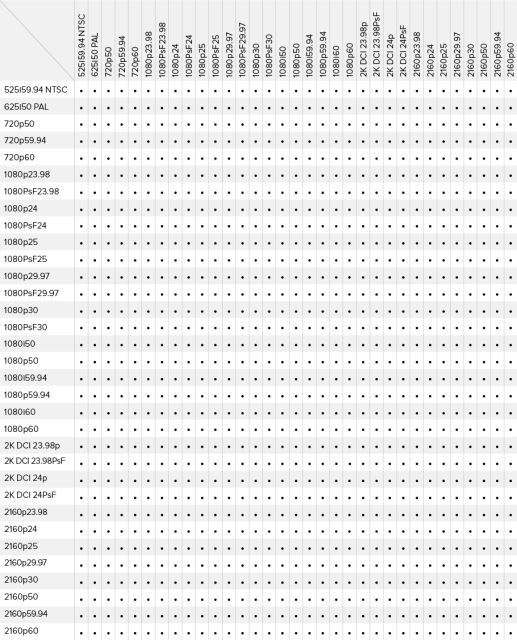 Con el convertidor Teranex AV, los usuarios obtienen una potente herramienta para la conversión de estándares (1089 opciones de conversión diferentes) que admite todos los formatos habituales hasta una resolución de 2160p60 y con una calidad completa de 10 bits. Al igual que el resto de productos Teranex, el modelo Teranex AV utiliza algoritmos patentados y potentes circuitos DSP para lograr una conversión con la máxima transparencia. Ofrece métodos avanzados para la eliminación de semicuadros, el aumento o la reducción de la imagen, la reducción de ruido y la detección/eliminación automática de cadencia, y conserva el código de tiempo y otros datos complementarios.
