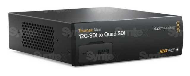 El producto Teranex Mini 12G-SDI to Quad SDI convierte la señal 12G-SDI a Quad-Link SDI para permitir la coexistencia sin problemas de la tecnología 12G-SDI Ultra HD más reciente en entornos de trabajo que también utilizan equipos Ultra HD con interfaz Quad-Link SDI. Este modelo también permite convertir la señal Ultra HD SDI en cuatro salidas HD-SDI, por ejemplo, para pantallas HD convencionales que forman murales de visualización en salas de control.