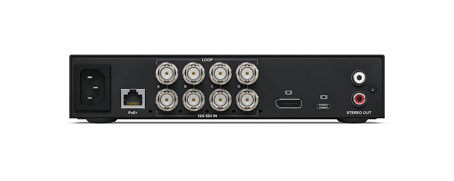 El panel frontal alberga los controles y una pantalla a color para visualizar la señal presente en la entrada de vídeo, los medidores de audio y el indicador de formato de vídeo. El panel trasero ofrece una interfaz Quad Link 12G-SDI compatible con los estándares HD, Ultra HD y 8K. Tampoco faltan dos conectores DisplayPort: uno estándar y otro tipo USB-C para los nuevos monitores, como el Pro Display XDR. La función integrada para cambiar la resolución de vídeo garantiza la presencia de una señal de vídeo correcta para el monitor conectado a la interfaz DisplayPort.