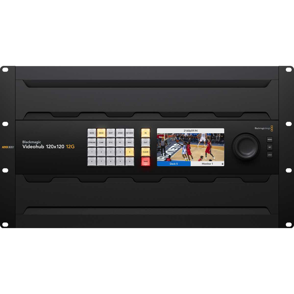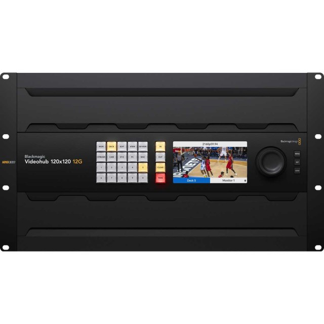 El enrutador de vídeo Blackmagic Videohub 120x120 12G cuenta con un panel frontal con botones para facilitar las conexiones, una pantalla LCD que puede mostrar etiquetas o vídeo en directo, un mando giratorio metálico para navegar por las fuentes de vídeo, conexiones de referencia y alimentación redundante. También ofrece latencia cero, re-clocking SDI y control externo a través de Ethernet.Disponible a partir de abril de 2024.