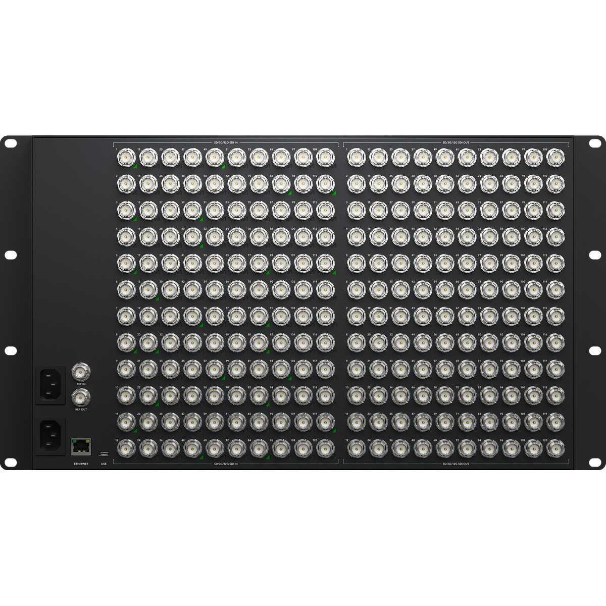 Todos los modelos Blackmagic Videohub 12G están equipados con una interfaz 12G-SDI avanzada, que es multirrate, por lo que admite cualquier formato de vídeo SD, HD y Ultra HD hasta 2160p60 y se conecta a cualquier dispositivo SD, HD-SDI, 3G-SDI, 6G-SDI y 12G-SDI. Además, el Blackmagic Videohub 12G también admite el enrutamiento de cualquier estándar de vídeo en el mismo router simultáneamente. Esto significa que, en el modelo 120x120, los usuarios pueden enrutar hasta 120 señales de vídeo diferentes a 120 salidas al mismo tiempo.