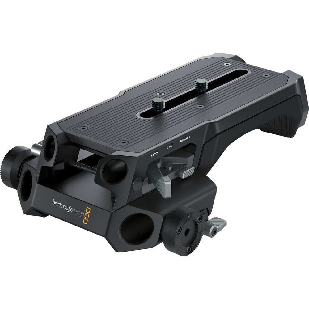 La placa base Blackmagic URSA Cine de 19 mm ofrece una solución robusta para montar la cámara URSA Cine 12K. Está equipada con puertos de barra de estudio de 19 mm y LWS de 15 mm, dos rosetas y una base para brazo, lo que permite una configuración versátil con trípode o soporte de brazo.