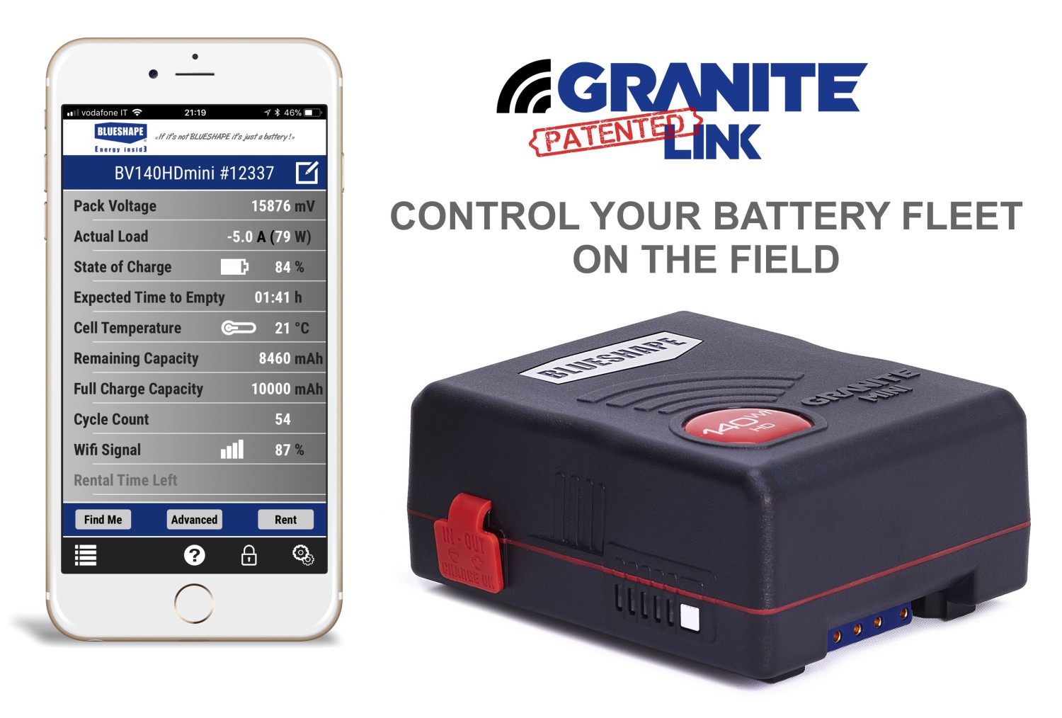 Batería VLock, diseño resistente a los golpes GRANITE, conexión GRANITE LINK Wi-Fi, resistencia a la lluvia IP54, control mediante aplicación, consumo máximo de 12 A