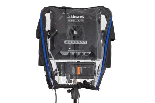 La carcasa impide que el agua llegue a la batería V-Lock o Gold Mount, a la unidad de control o a cualquier adaptador de CA/CC. La cinta elástica de alta densidad de la parte inferior permite fijar la carcasa a un soporte de iluminación o a cualquier otra solución de montaje. Al mismo tiempo, su longitud reduce la posibilidad de que el agua penetre en el panel por la parte inferior. La longitud total de la cubierta es de 52 cm (20,5").
