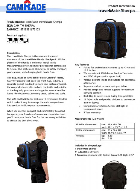La mochila para cámaras travelMate Sherpa es la sucesora del popular modelo travelMate Handy 1. Ofrece espacio suficiente para transportar de forma segura cámaras de hasta 43 cm de longitud, material resistente (Cordura®) y cremalleras de alta calidad (YKK®), un compartimento independiente para tableta/portátil en la parte delantera y, por supuesto, bolsillos interiores y exteriores para transportar documentos, tarjetas de memoria, cables, etc.
