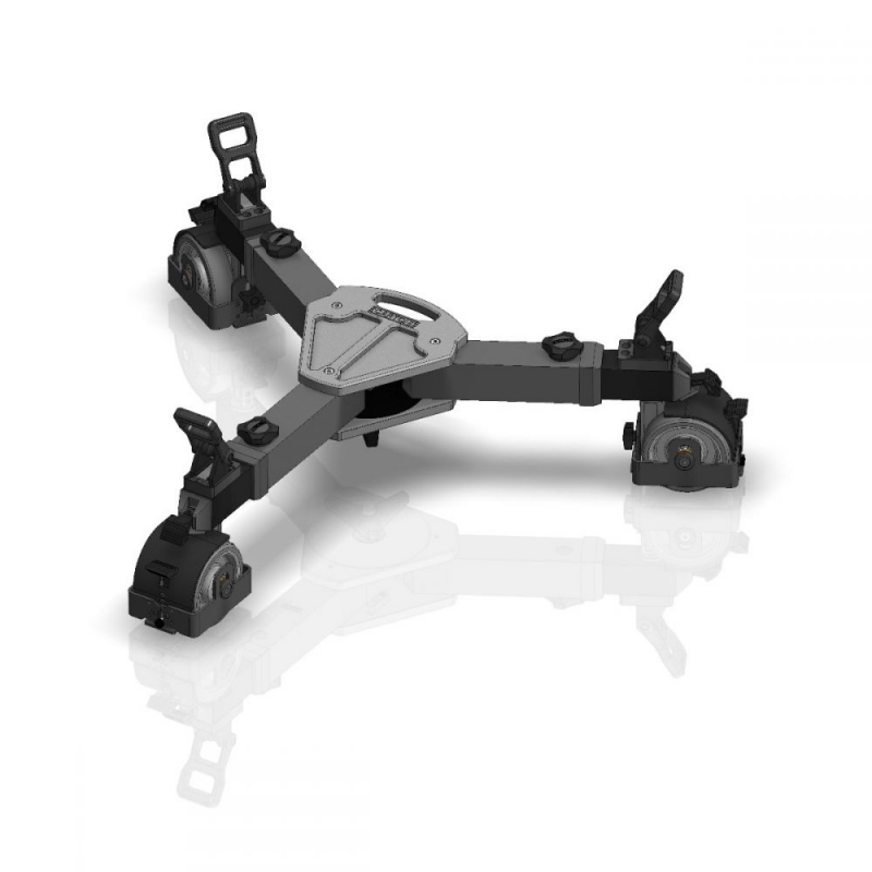 Este chasis de aluminio con ruedas extensibles está diseñado para trípodes EFP y trípodes de estudio (1 y 2 niveles).