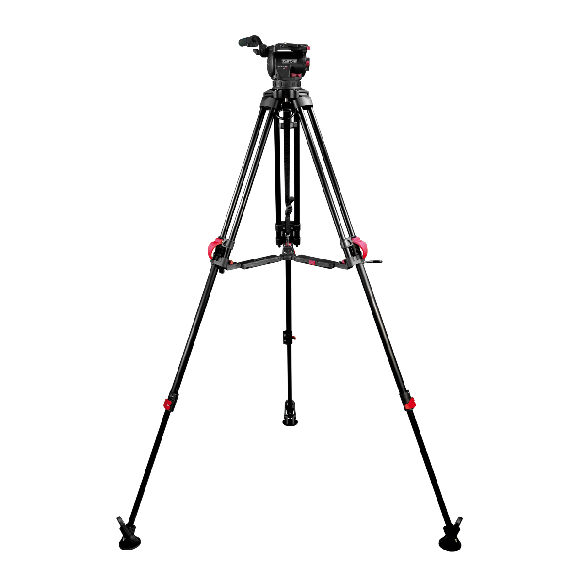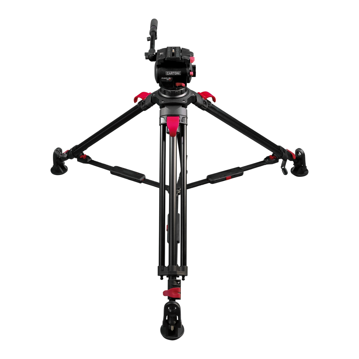 Conjunto de trípode que incluye el cabezal Focus 10 Fluid Head, las patas Red Lock Alu, el travesaño central con sistema Smart Lock, las almohadillas de goma y la bolsa de transporte.
