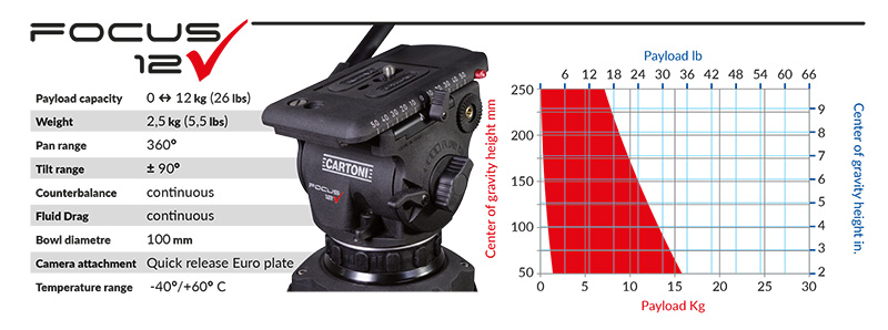 El Cartoni Focus 12 soporta cámaras de hasta 12 kg de peso, por lo que es adecuado no solo para cámaras DSLR/DSLM, sino también para cámaras de reportajes. Ofrece unas dimensiones y un peso reducidos, una fricción ajustable de forma continua tanto en el giro como en la inclinación (+/- 90°) y un sistema patentado de contrapeso variable. Incluye una placa de cámara deslizante de fijación rápida, un nivel de burbuja retroiluminado y una empuñadura. El Focus 12 es compatible con todos los trípodes equipados con una rótula de 100 mm y es una excelente opción para los realizadores de programas de noticias y documentales.