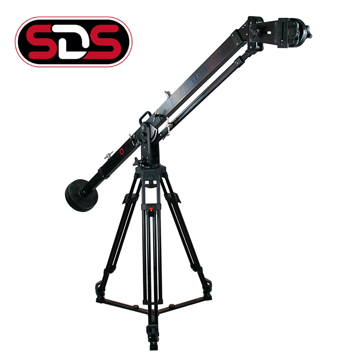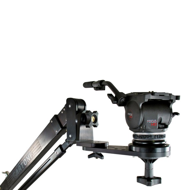 La parte trasera del brazo, que sostiene los contrapesos, es extensible para proporcionar un equilibrio preciso de la cámara; el kit de contrapesos típico consta de 25 kg de pesas de gimnasio recubiertas de goma. El brazo telescópico delantero permite que el CARTONI JIBO funcione en una amplia variedad de posiciones de filmación o requisitos. El cabezal fluido que soporta la cámara se puede colocar en varias posiciones diferentes, como suspendido por debajo, lateralmente, etc.