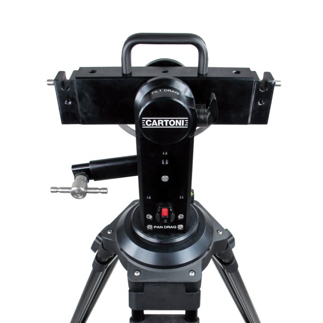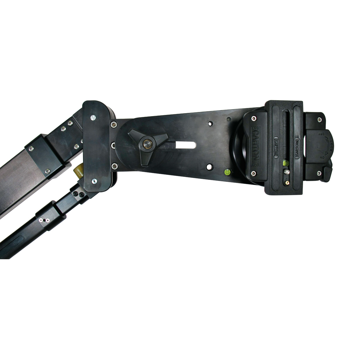 La parte trasera del brazo, que sostiene los contrapesos, es extensible para proporcionar un equilibrio preciso de la cámara; el kit de contrapesos típico consta de 25 kg de pesas de gimnasio recubiertas de goma. El brazo telescópico delantero permite que el CARTONI JIBO funcione en una amplia variedad de posiciones de filmación o requisitos. El cabezal fluido que soporta la cámara puede colocarse en varias posiciones diferentes, como suspendido por debajo, lateralmente, etc.