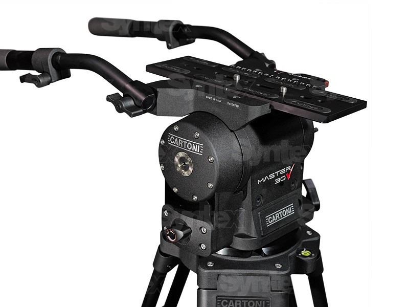 El cabezal Master 30 / Cine se basa en el famoso modelo Cartoni Maxima, pero con un diseño más compacto y un peso reducido de 10,5 kg. Los ajustes del contrapeso y los valores de panorámica/inclinación se muestran en la pantalla, y los niveles de burbuja están retroiluminados. Para facilitar al máximo su uso, los frenos de panorámica/inclinación están situados en el lado izquierdo del cabezal, y la placa de la cámara está asegurada con un nuevo cierre de seguridad. La placa de la cámara es además ampliamente compatible, se puede deslizar 140 mm hacia delante y hacia atrás y está provista de una escala. Tampoco faltan cuatro rosetas para las asas panorámicas.