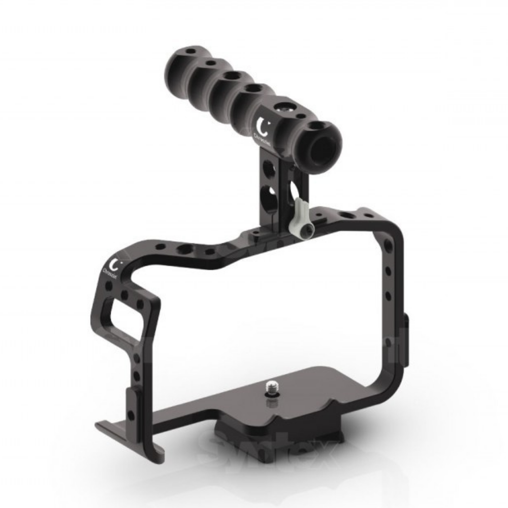 El kit «700-GH5-EASY» es una jaula para cámara con empuñadura para la Panasonic GH5. La empuñadura (700-HANDLE), con roscas de 3/8" y 1/4", se puede desmontar fácilmente, por ejemplo, para transportar el equipo. La jaula (700-CAGE) también está equipada con roscas de 3/8" y 1/4" y se puede fijar directamente a los trípodes Sachtler ACE y Manfrotto 501/701…