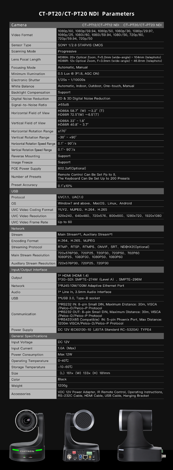 La cámara CT-PT12 es ideal para instalaciones fijas; se puede montar en un trípode o instalar en la pared o el techo. Se trata de una cámara fiable con un amplio equipamiento funcional, adecuada para entornos de vídeo dinámicos y profesionales.