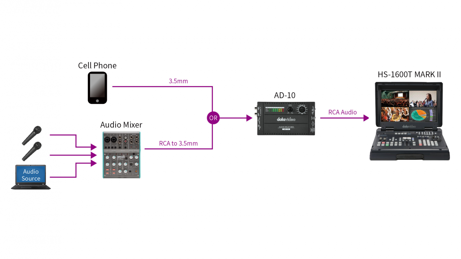 La línea de retardo Datavideo AD-10 permite sincronizar con precisión el audio con el vídeo: ofrece un retardo de hasta 400 ms fácilmente ajustable mediante un control giratorio, entradas estéreo no balanceadas (TRS) y salidas (RCA), la posibilidad de cambiar entre el nivel de entrada de línea y el de micrófono, un indicador LED de nivel de ocho segmentos y alimentación a través de la interfaz USB-C.