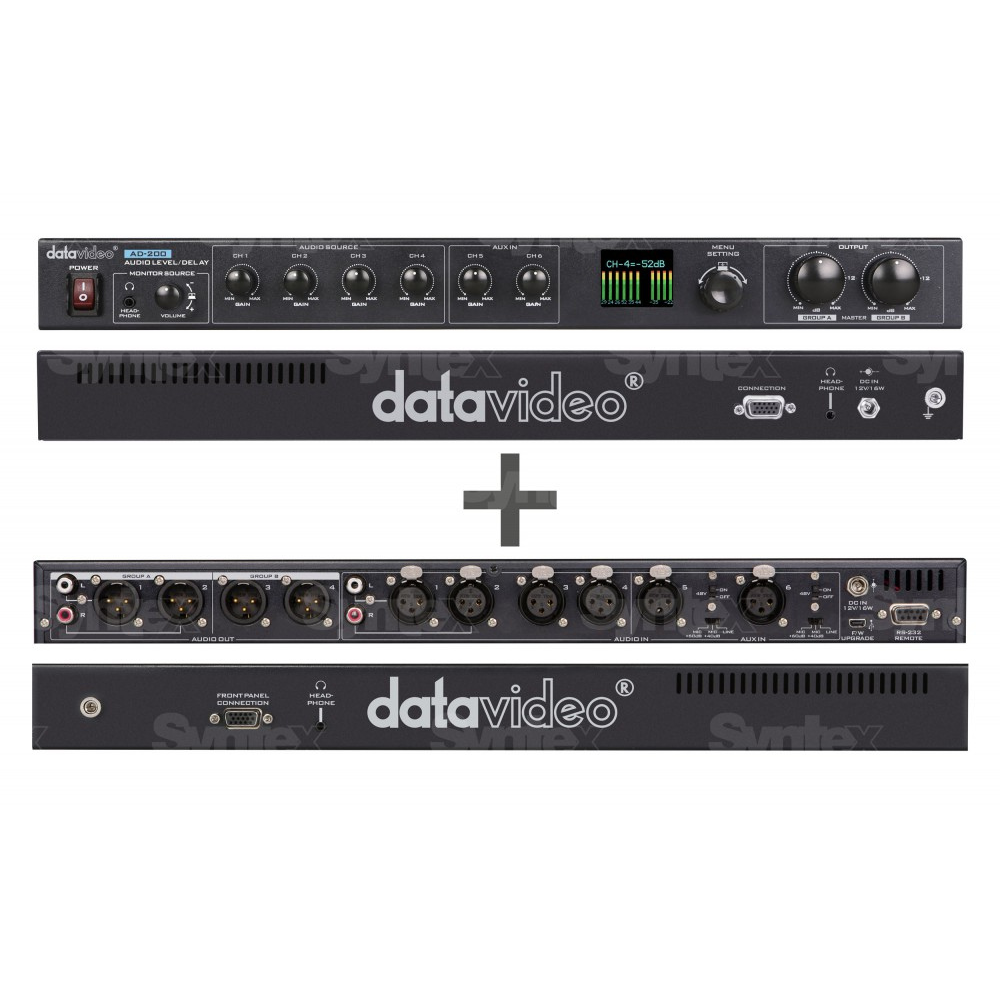 El AD-200 de Datavideo es un dispositivo de 1U para el enrutamiento, la mezcla, el ajuste de niveles y el retardo de hasta cuatro líneas de audio balanceadas y dos líneas auxiliares. El producto combina algunas de las funciones de la línea de retardo AD-100 y del mezclador de audio AM-100 en una sola unidad universal, diseñada para su instalación en unidades móviles o en racks de estudio.